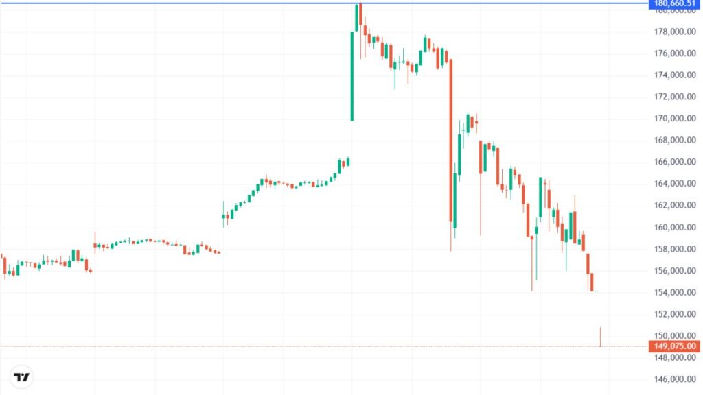 Analysis: Gold has seen a decline of 17.45%. Compared to Silver, Gold has broken less, indicating that despite the panic, investors still have some faith in the yellow metal. After breaking the ₹1.80 Lakh level, coming down to ₹1.49 Lakh might be an opportunity for those looking to buy jewelry for weddings.